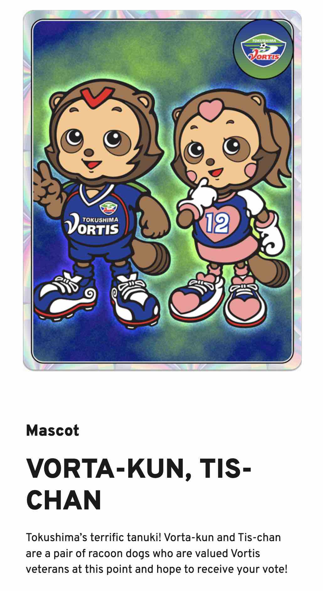At every game, and at many local events, fans can meet the team mascots - according to their official page on the J.League web site (see image) they are Tokushima’s terrific tanuki! Vorta-kun and Tis-chan are a pair of racoon dogs who are valued Vortis veterans!