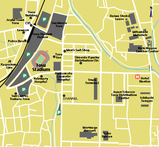 Stadium AccessTosu stadium is located directly in front of a major train station located at the junction of the JR Nagasaki line and the JR Kagoshima line. You can see the magnificent angular framework of the double-tiered stands from the train platform, so there should be no difficulty at all finding your way to your seats. Tosu station can also be reached easily by car, as it is just a few hundred meters from the Tosu Stadium exit on the Kyushu expressway. |