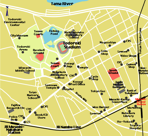 Stadium AccessThe closest train station to Todoroki Stadium is Shin Maruko station, on the Tokyu Toyoko line, which is about a 15 minute walk from the stadium. Exit the station using the west exit and walk north to the main road (the Nakahara Kaido). Turn left and follow Nakahara Kaido until it veers sharply to the left, next to a small temple. A narrower road leads off to the right, and the trees of Todoroki park are visible just down the road. Alternatively, from Musashi Nakahara station on the JR Nambu line, the main road outside the north exit is also Nakahara Kaido. Follow this road northwest, away from the station, until it crosses another main road (route 409), with a hospital at the intersection. Cross route 409 and turn left, continuing past Nakahara Elementary school until the main entrance to the park comes in sight, off to the right |