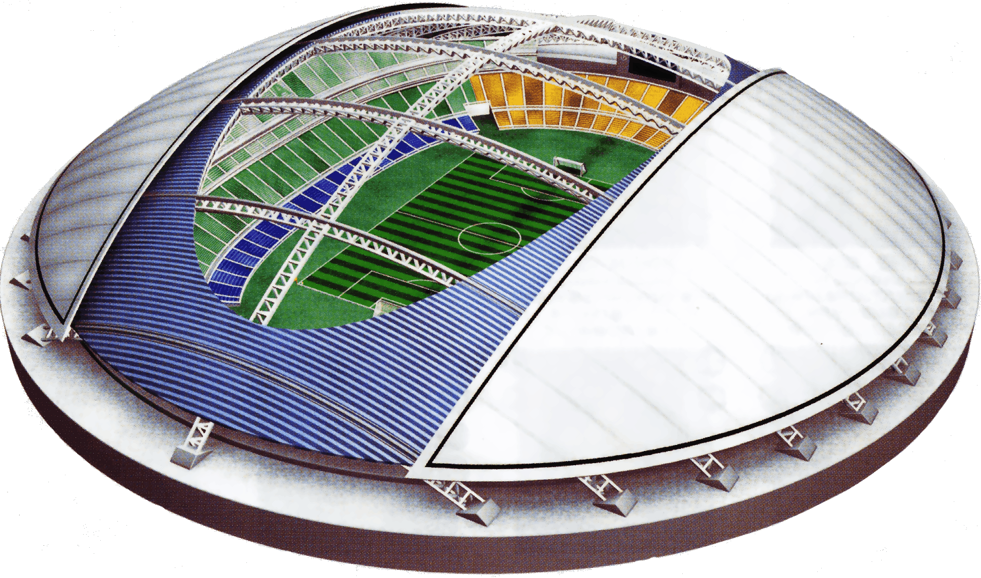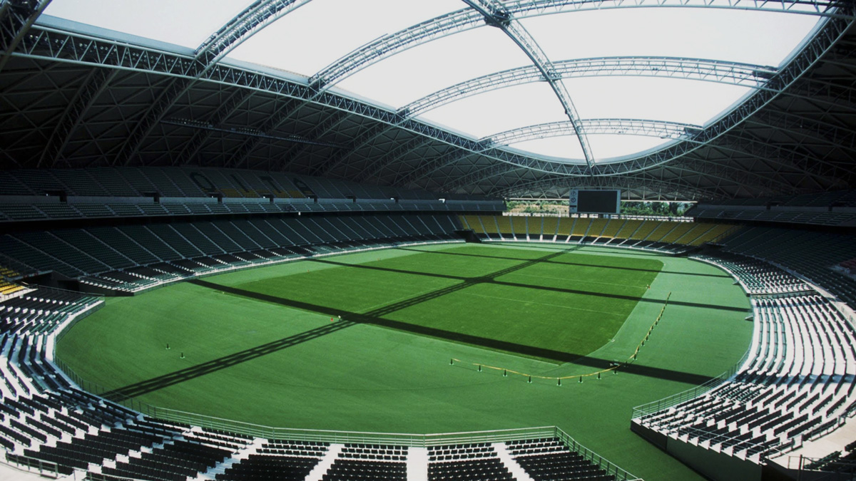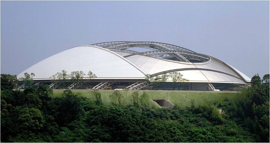 In fact, Oita Stadium may be less well known than some of the other venues among football fans, but in the architectural world, it is one of the highlights of the 2002 World Cup. It was chosen by Architecture Week magazine as the best stadium design in the world, in 2001. The stationary portion of the roof is clad in titanium, giving it a futuristic appearance. The interior is very light and airy, thanks to the Teflon panels of the movable roof structure. The membrane is not only lighter in weight than glass, but it has great tensile strength and is impermeable to any weather. The retractable roof operates with a drive-type wire traction system. When closing, the roof sections move up from the two sides along the main beam arch, meeting exactly above the center of the field, just like an eyelid closing shut . | ![]() |